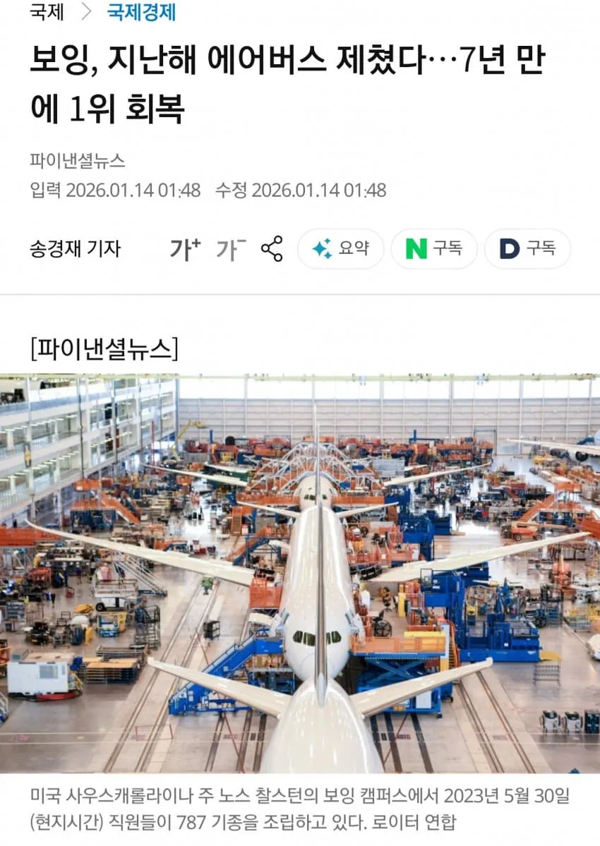 7년만에 처음으로 신규 항공기 수주량에서 에어버스를 이겼다고함.