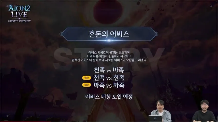 4. 혼돈의 어비스 예고 - 천족/마족 불균형을 해결하기 위한 방안 - 종족 무관하게 서버별 매칭이 이루어지며 3월 도입 예정 - 시공의 균열 또한 어느 서버로 갈지 모르게 매칭이 바뀔 예정 - 상호 간에 채팅은 불가능 - 해당 시스템 도입 시 3:0 패배 시 제공되는 회랑, 패배 버프 등의 시스템은 정리 예정