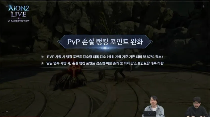 1. PVP 개선 - PVP 사망 시 랭킹 포인트 감소량 대폭 감소 (상위 계급 기준 기존 대비 약 87% 감소) - 일일 연속 사망 시 랭킹 포인트 감소량 비율 증가 + 최저 감소 포인트량 대폭 하향