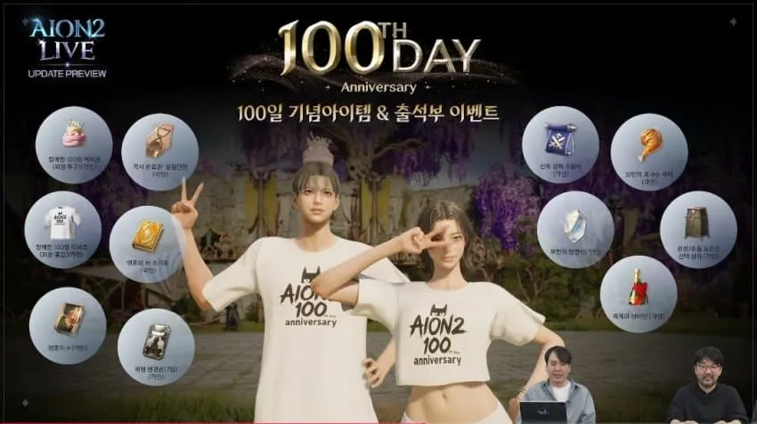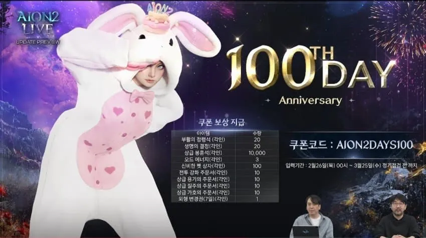 23. 100일 기념 출석부&이벤트&쿠폰 - 함께한 100일 케이크(외형:투구), 함께한 100일 티셔츠(외형:흉갑) 등 상점에서 키나로 구매 가능 - 3월 11일(수)까지 100큐나로 염색 50% 할인 - 쿠폰코드 [ AION2DAYS100 ]