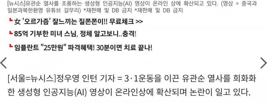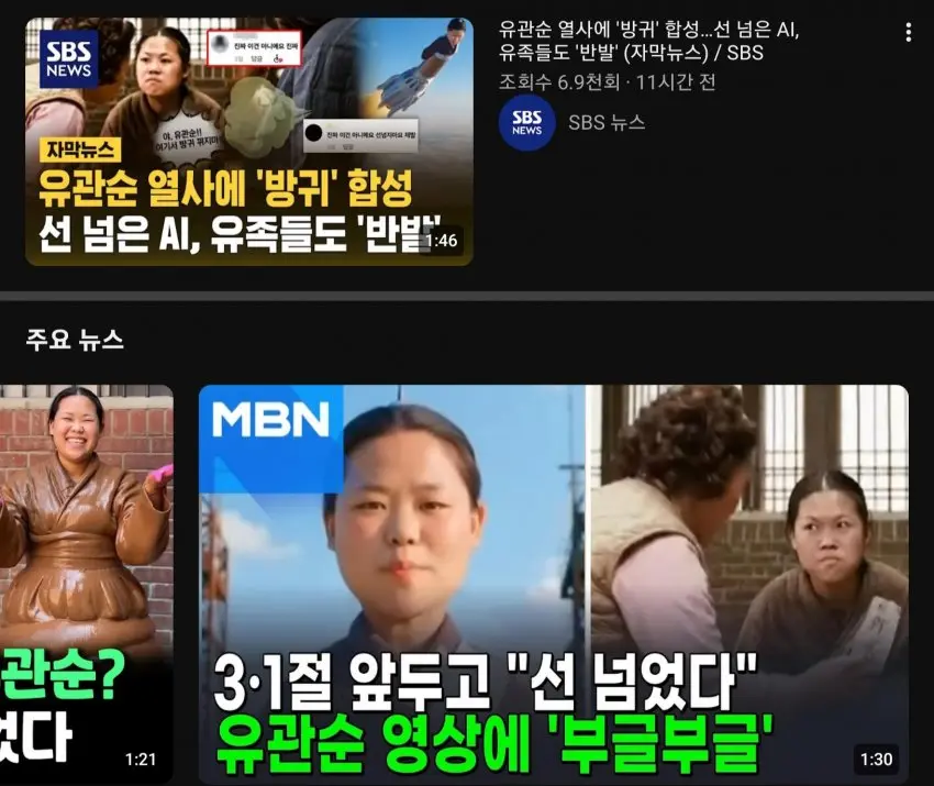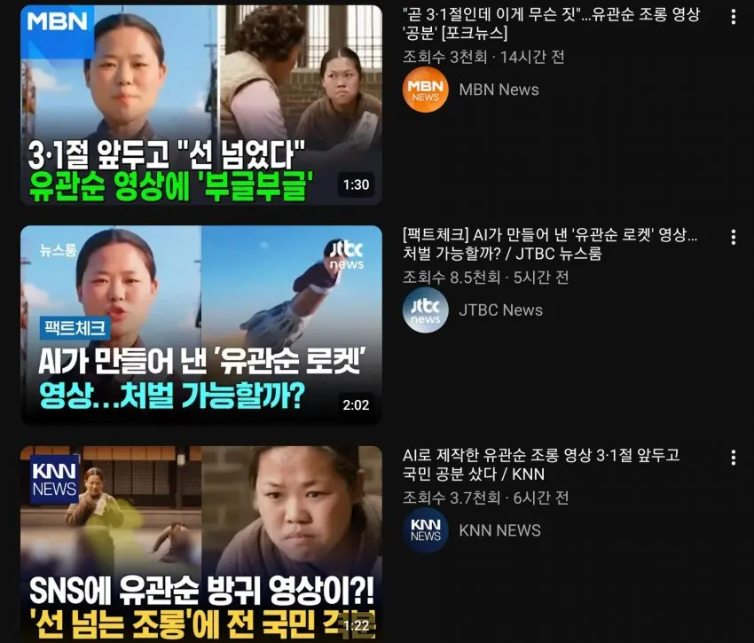 https://n.news.naver.com/article/001/0015928651- 관련게시물 : 3·1절 앞두고 '유관순 방귀' 영상 공분…AI 역사재현의 양면