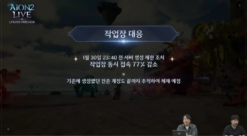 1. 작업장 대응 관련 - 1월 30일(금) 23시 40분 전 서버 생성 제한 조치 적용, 작업장 동시 접속 77% 감소 - 잔존 계정도 추적하여 제재 예정 - 실명 인증 도입 준비중