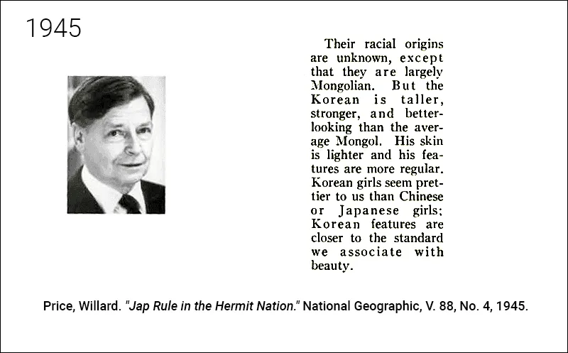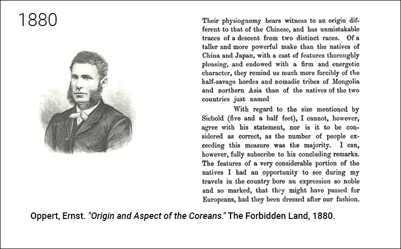 그들의 인종적 기원은 대부분 몽골인이라는 것 외에는 알려져 있지 않다. 그러나 조선인은 보통의 몽골인보다 키가 크고, 힘이 세고, 더 잘 생겼다. 피부가 더 밝고 이목구비가 더 규칙적이다. 조선 여자들은 중국이나 일본 여자들보다 더 예뻐 보이고, 조선인의 이목구비는 우리가 생각하는 미의 기준에 더 가깝다.
