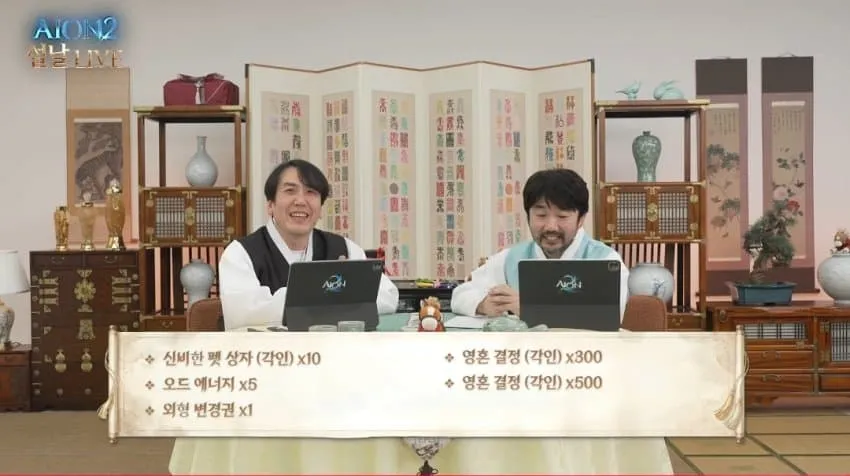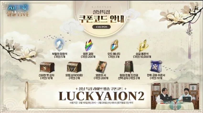 17. 라이브 방송 보상 - 신비한 펫 상자 10개, 오드 에너지 10개, 외형변경권 1개, 영혼 결정 800개, 영혼의 서 300개, 부활의 정령석 5개, 콘텐츠 이용 충전권 선택 상자 5개, 영혼의 서: 초기화 6개, 원정/초월 도전권 선택 상자 5개 - 추가로 2주 동안 푸시로 오드 에너지 1개씩 매일 지급 - 설날특집 쿠폰 [ LUCKYAION2 ]