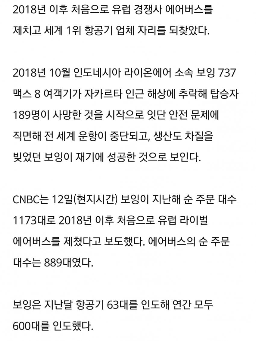 7년만에 처음으로 신규 항공기 수주량에서 에어버스를 이겼다고함.