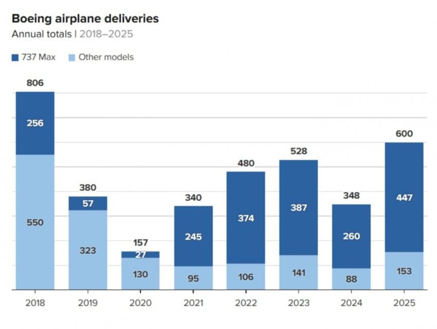 2025년에는 에어버스가 항공기 793대를 인도할동안
