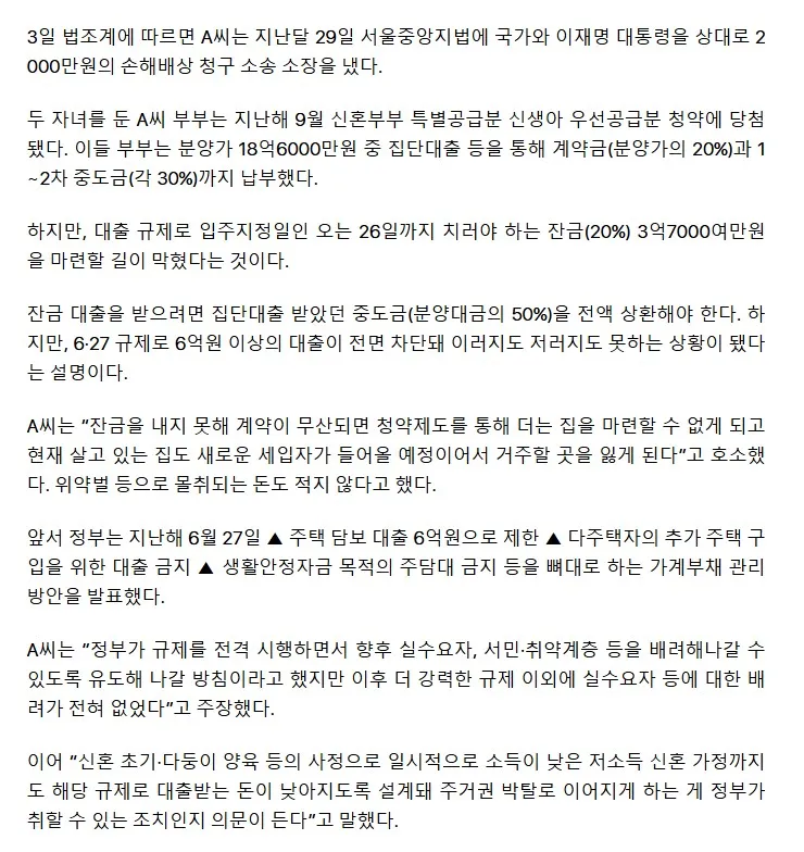 중도금까지 냈는데 갑작스런 규제를 소급적용하여 잔금대출이 불가능해짐(3억7천만원)