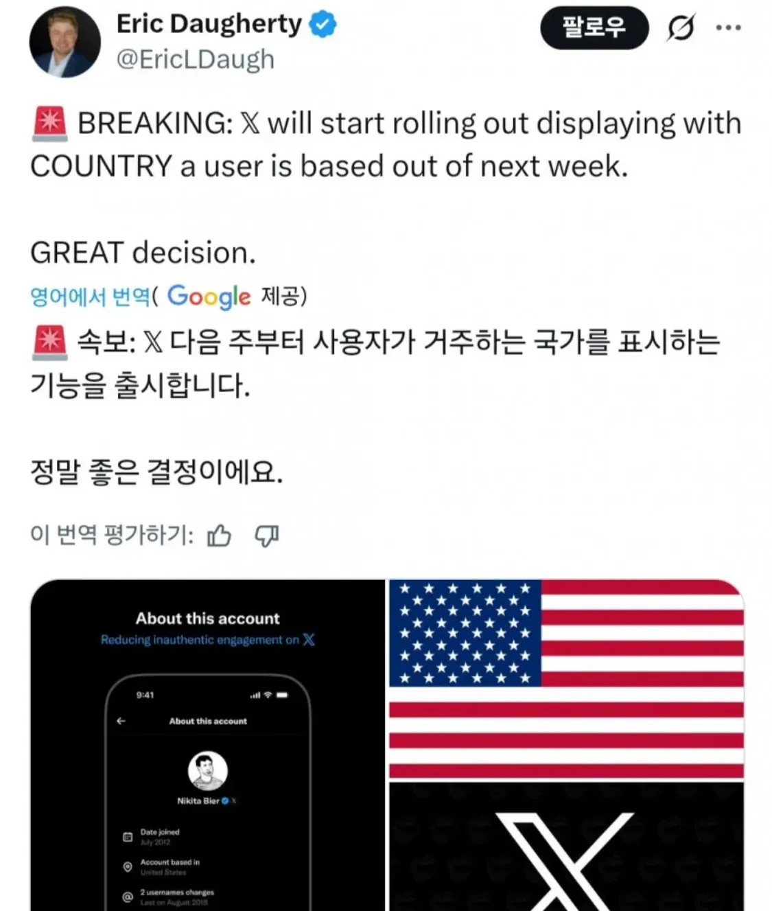 X 국적 표기에 대해서, VPN을 사용하면 우회 가능하지 않냐하는데, VPN으로 의심시에, 느낌표로 알게 하는 기능이 있음.