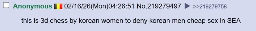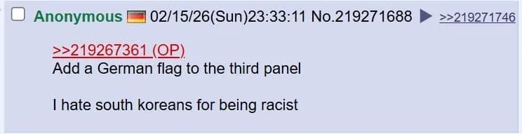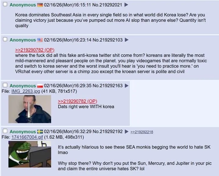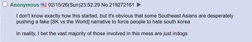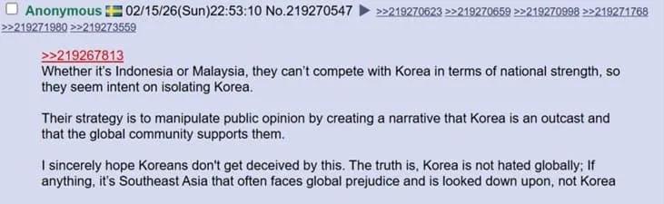 한국인들이 이런 것에 속지 않기를 바람. 한국은 세계에서 미움 받지 않음. 오히려 세계적으로 편견의 대상이 되고 낮게 평가받는 쪽은 동남아시아인 경우가 더 많지, 한국이 아님