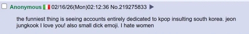 이탈리아: 존나 웃긴건 한국 까는 계정 중 케이팝 계정들임 전정국 사랑해요 올려놓고 집게 손가락 올리고 그러면서 여자는 싫어요