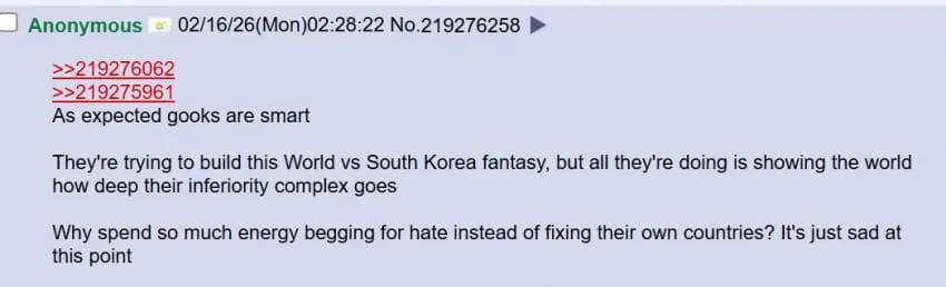 세계 대 한국이라는 환상을 만들려고 애쓰지만 결국 그들의 열등감 뿌리 깊게 박힌 모습만 전 세계에 보여줄 뿐이야.