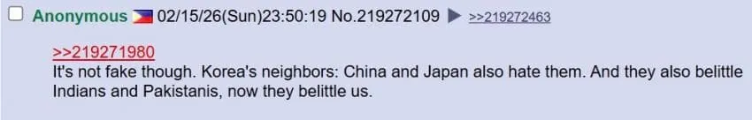 필리핀:(위에 루마니아인한테) 이건 가짜 여론이 아님, 한국의 이웃들 중국 일본도 다 한국 싫어함 게다가 이제는 인도인들과 파키스탄인들도 깎아내리더니 우리까지 깎아내리고 있음