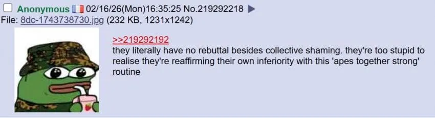 저 “원숭이들끼리 뭉치면 강하다” 식의 행동이 오히려 자기들 열등함을 다시 확인해 주는 꼴이라는 걸 깨닫기엔 너무 어리석은듯