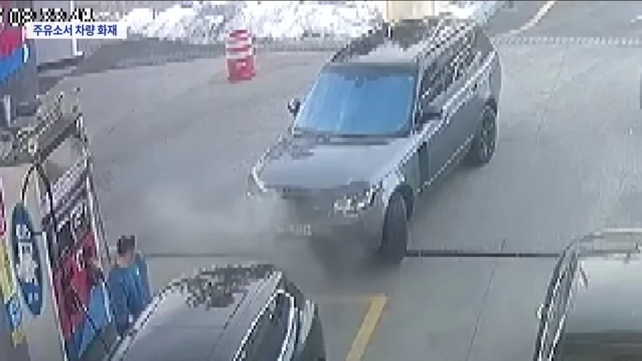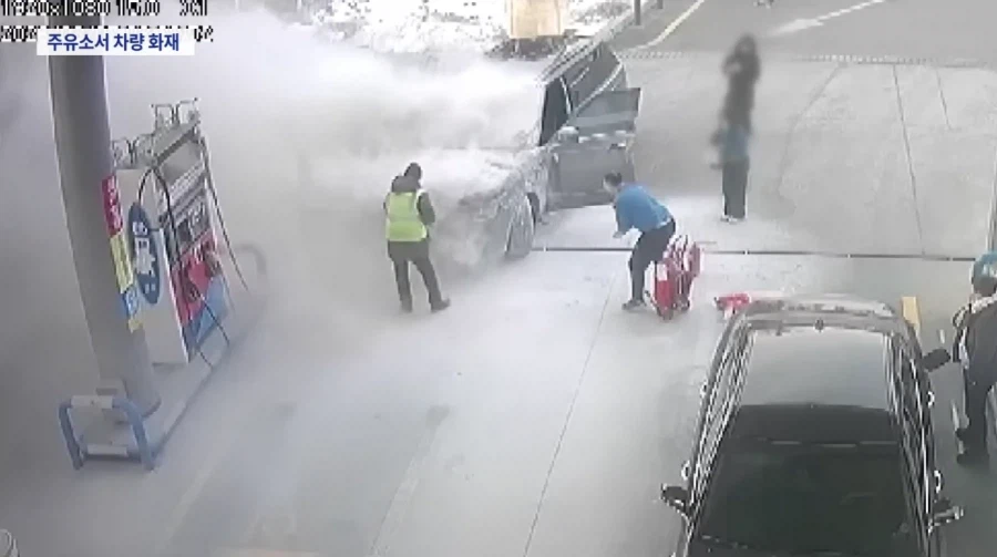 차량 보닛에서 연기가 나는 상태로 주유소로 진입한 차량